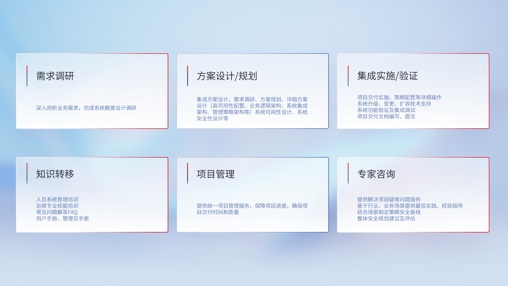 针对客户行业特性,,将宏观的安全战略和需求,,,通过专业的交付服务,,,实现项目落地,,为客户提供标准规范的集成交付服务。。